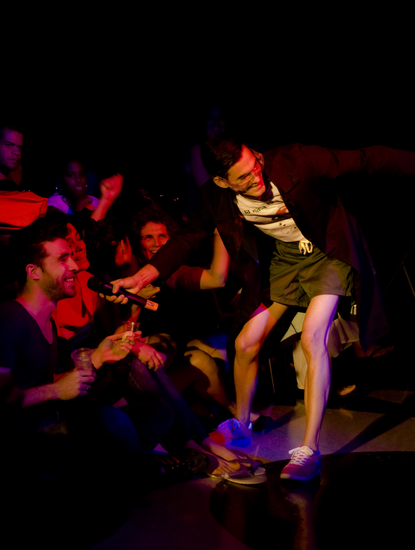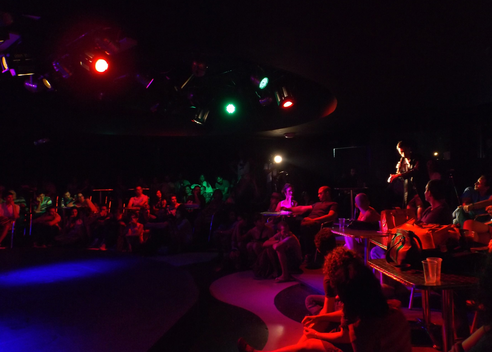 Performance que integra audiovisuales, DJs y acciones escénicas.